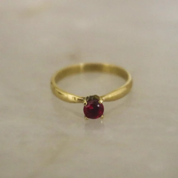 Uma joia que exala paixão, poder e sofisticação. O Anel Brilho Carmesim é uma peça de destaque, centrada em uma magnífica gema de tom vermelho profundo e magnético, que simboliza a força e a elegância feminina.